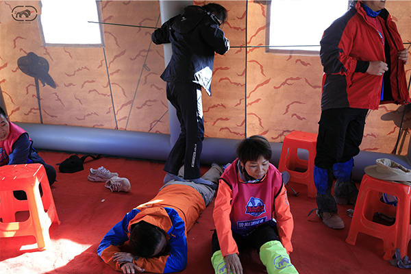 傍晚達到營地,每個人都風塵仆仆,脫下襪子腳腫了一圈,有的襪子被血水模糊了,撕下來淚水隱忍而出。看著周邊的同伴,原以為她自己情況是最慘的,但不知團隊里有人原本就膝蓋痛,有的人發(fā)燒,有的人也來例假,有的人近240斤仍不懈前行,有的人比自己還要高齡也不放棄。