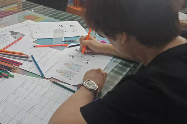 盡管困難重重,我們也要想進(jìn)一切辦法做到,不僅要做好,而且要做到最好!我們的總經(jīng)理自己也搖身一變?cè)O(shè)計(jì)師——畫(huà)稿,可以看到以下的圖片,認(rèn)真、負(fù)責(zé)的態(tài)度,用心的為客戶所思,一筆一筆的畫(huà)好,一點(diǎn)點(diǎn)的涂好顏色;還有一個(gè)紙樣哥哥也在幫忙畫(huà),他們兩個(gè)人在一兩天的時(shí)間內(nèi)要畫(huà)好接近10個(gè)款衣服和褲子,雖然我們的時(shí)間不多,但是睿牛的小伙伴們也是很努力的去做,努力過(guò)就不曾后悔。
