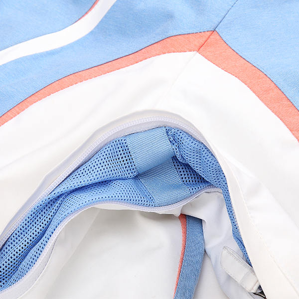 有些沖鋒衣的面料整體如同單層面料,銀灰色為通常的里料顏色,里料連接部位還能看到壓膠條。另外一種沖鋒衣是由獨立的兩個分層材料縫制而成,外表層面料是通過把具有防水功能且透氣性良好材料制成有特殊保護(hù)的織物組織結(jié)構(gòu)。此類外表面料的外層起防水透氣作用,內(nèi)層主要起排汗作用。里料層是另一層獨立的織物,里料和面料是可分開的,里料色彩一般為暗色,主要由錦綸材料、棉纖維之類吸汗材料制成,結(jié)構(gòu)主要以網(wǎng)格為主,面料的拼合部位的壓膠通常會被里料遮蓋住,只有網(wǎng)格結(jié)構(gòu)的里料才能看到壓膠處。