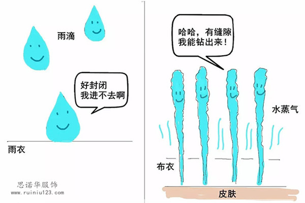 雨衣封閉,雨滴進不去。布衣有空隙,水蒸氣能出去。