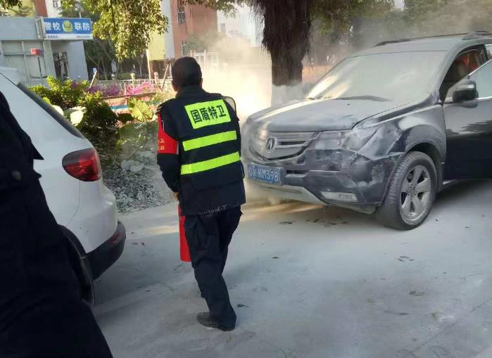 國(guó)盾特衛(wèi)樂(lè)從中學(xué)護(hù)衛(wèi)點(diǎn)執(zhí)勤保安人員陳蛟和糾察黃志剛發(fā)現(xiàn)火情,在及時(shí)通知隊(duì)長(zhǎng)張華東、大隊(duì)長(zhǎng)羅雪飛的同時(shí),首先疏散圍觀群眾,二人攜帶滅火器馬上趕往失火車輛場(chǎng),引導(dǎo)車主將車撤到安全地帶,發(fā)現(xiàn)由于發(fā)動(dòng)機(jī)火勢(shì)較猛,煙較大,導(dǎo)致車前蓋溫度較高,無(wú)法開(kāi)啟。 黃志剛和陳蛟從車前蓋縫隙的不同方向往發(fā)動(dòng)機(jī)噴射干粉滅火劑,由于車前蓋縫隙不大,一時(shí)間不能控制火勢(shì)。羅大隊(duì)接到通知從前門(mén)趕赴現(xiàn)場(chǎng)后,報(bào)火警119。在我們國(guó)盾特衛(wèi)樂(lè)從護(hù)衛(wèi)點(diǎn)安保員齊心協(xié)力十五分鐘使用干粉滅火器七罐,反復(fù)不間斷的實(shí)施撲救,終于控制火勢(shì),校方領(lǐng)導(dǎo)和巡警也陸續(xù)趕到,最后成功滅火。車主、巡警及校方領(lǐng)導(dǎo)對(duì)我們國(guó)盾特衛(wèi)保安員立足本職工作、履行社會(huì)責(zé)任給予認(rèn)可和肯定。