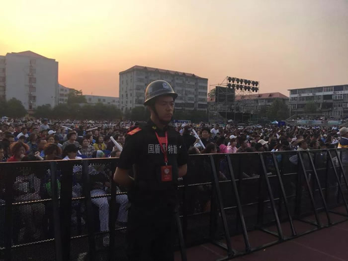 國盾特勤人員提前一天到達現場,進行安保設施設備的布置,活動現場設置多道檢驗口。檢票口要求做到檢票無誤,入場觀眾通過安檢門、X光機等安檢設備檢查,確保將易燃易爆等違禁品拒之門外。每一道安檢口嚴格把關,把危險攔截在門外。
