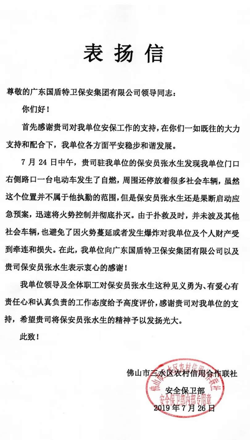 7月24日中午,三水西南農(nóng)村信用社路口,一臺電動(dòng)車突然發(fā)生了自燃,驚慌失措的車主不知如何處置,如果任由火勢蔓延將危及停放在旁邊的其它機(jī)動(dòng)車輛,后果不堪設(shè)想。火情就是戰(zhàn)情,在此執(zhí)勤的佛山國盾特衛(wèi)保安服務(wù)有限公司保安員張水生同志迅速向信用社和分隊(duì)領(lǐng)導(dǎo)匯報(bào),同時(shí)采取有效措施及時(shí)撲救。因處置得當(dāng),終于化險(xiǎn)為夷。 張水生同志這種險(xiǎn)情面前臨危不懼處置果斷的行為贏得了三水農(nóng)村信用社和在場市民的贊揚(yáng)。