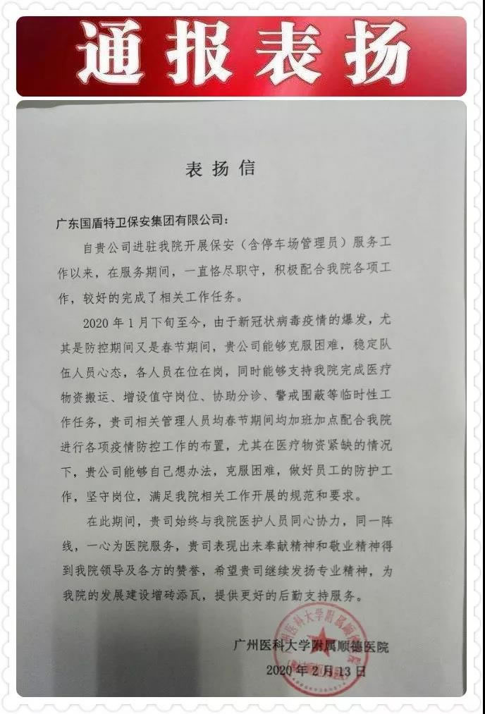 疫情當前,我司保安員無論深夜,還是清晨,都一直默默堅守各自崗位護佑平安,始終與醫護人員同心協力,打贏這場疫情防控阻擊戰。保安員表現出來的無私奉獻和愛崗敬業精神,贏得了廣州醫科大學附屬順德醫院領導及各方的一致贊譽。