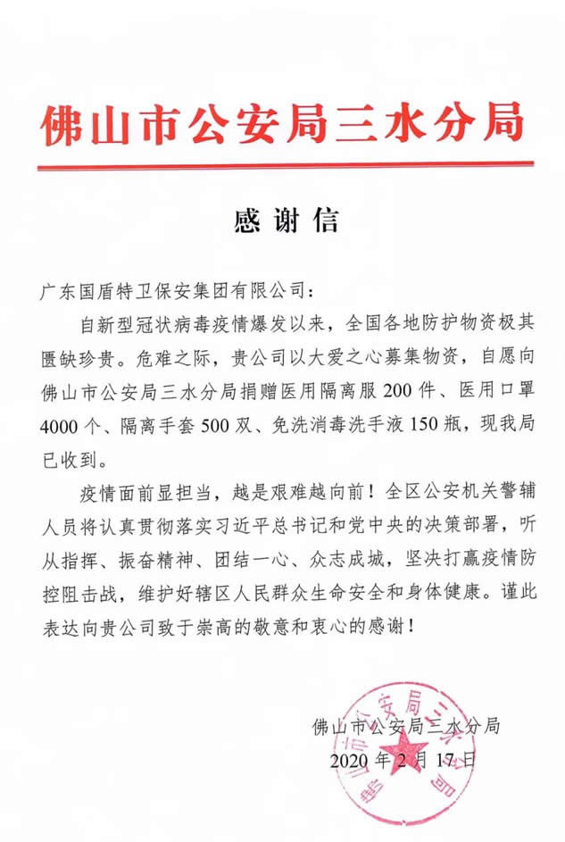 三水區(qū)公安分局特向廣東國盾特衛(wèi)保安集團有限公司發(fā)來了感謝信,感謝國盾特衛(wèi)保安集團具有社會責任擔當?shù)拇髳劬瘢^(qū)公安分局領導負責人代表向三水區(qū)禁毒協(xié)會、廣東國盾特衛(wèi)保安集團有限公司表示感謝,并要求全體參戰(zhàn)警輔人員,越是危難時刻越要勇于擔當、忠誠履職,不辱使命、不負眾望,堅決打贏疫情防控阻擊戰(zhàn),讓人民群眾安心放心。