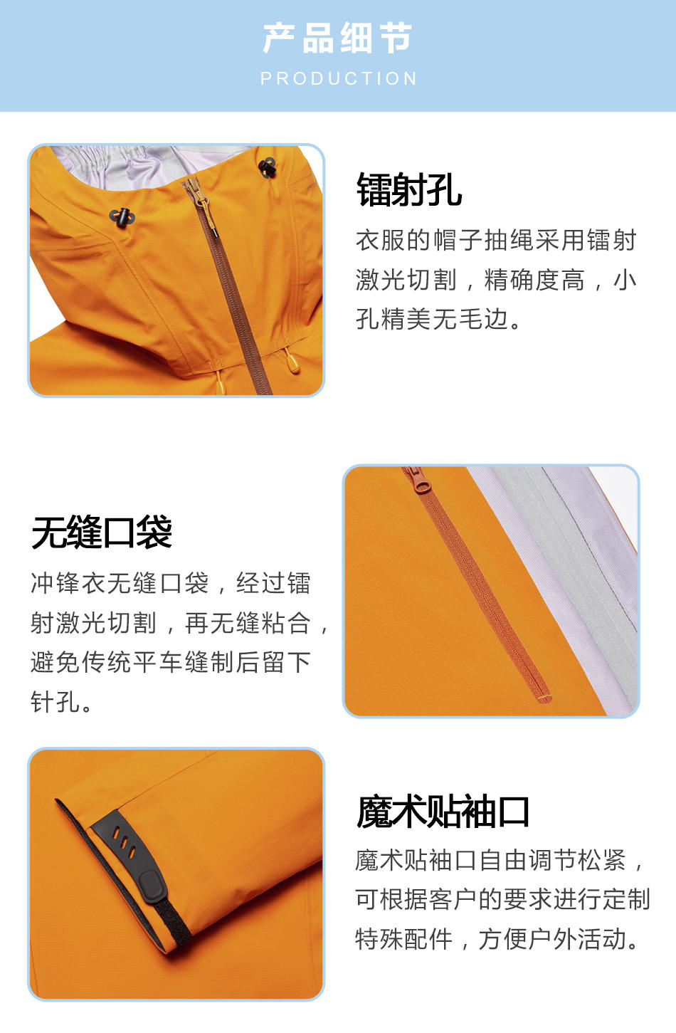 無縫口袋:沖鋒衣無縫口袋,經過鐳射激光切割,再無縫粘合,避免傳統平車縫制后留下針孔。