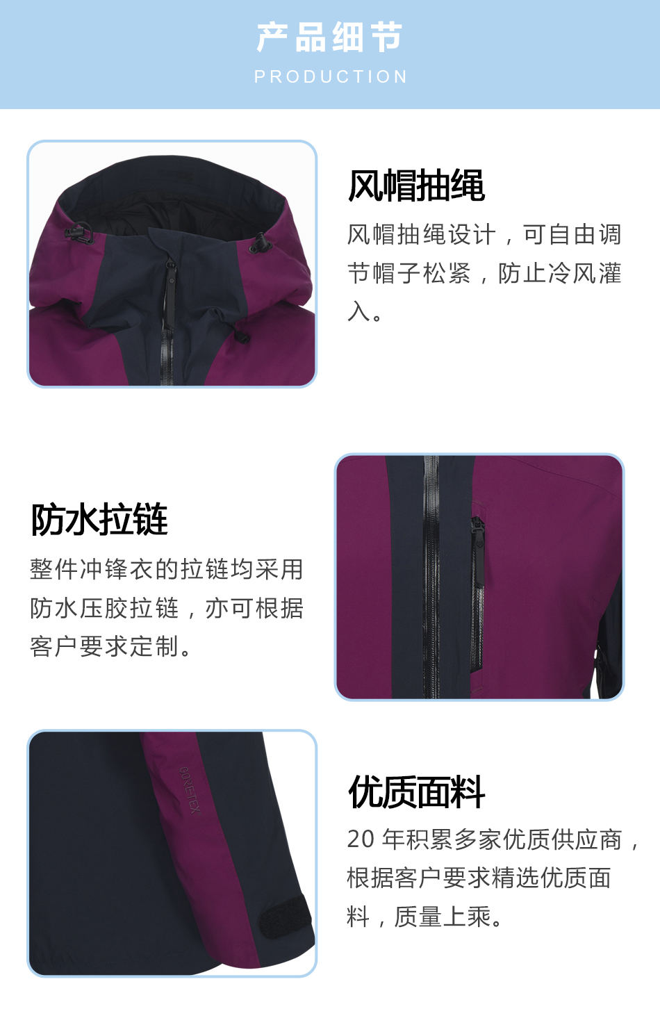 • 防水拉鏈:整件沖鋒衣的拉鏈均采用防水壓膠拉鏈,亦可根據客戶要求定制。